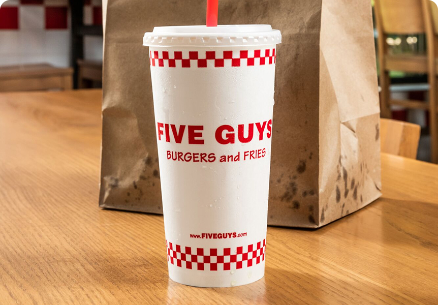 Complete your Five Guys meal with a crisp, cold beverage. We proudly serve Coca-Cola and Dr Pepper products