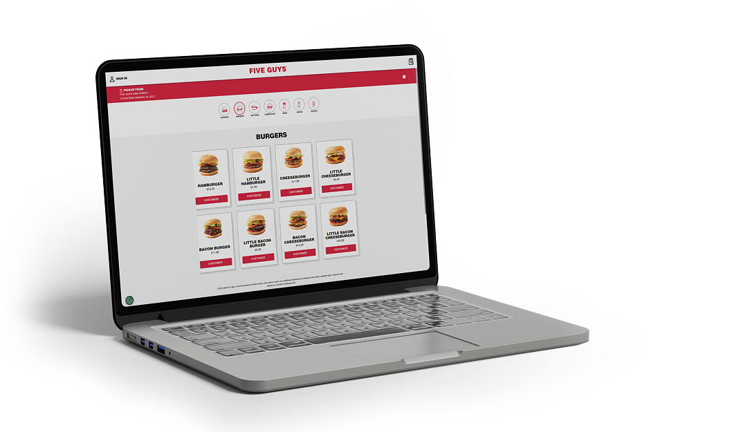 With online ordering from Five Guys, it’s never been easier to get your fix. There’s plenty of ways to order online, too. Order straight from our site or use our mobile app to get any limited-time offers, the best price and to save your favorites!