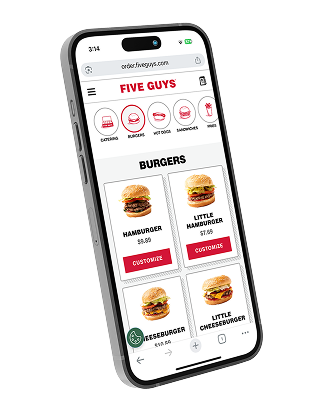 Five Guys is always a tap away with the Five Guys mobile app. You can place orders ahead of time, customize to your heart’s content, save your favorite orders, plan large orders, and so much more.